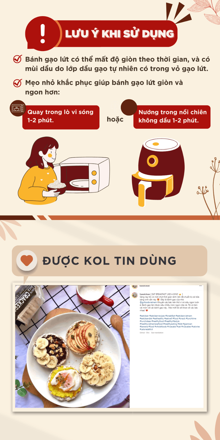 ✓ Sản phẩm có thể mất độ giòn theo thời gian, và có mùi dầu do lớp dầu gạo tự nhiên có trong vỏ gạo lứt, có thể khắc phục bằng cách quay trong lò vi sóng hoặc nồi chiên không dầu trong 1-2 phút
