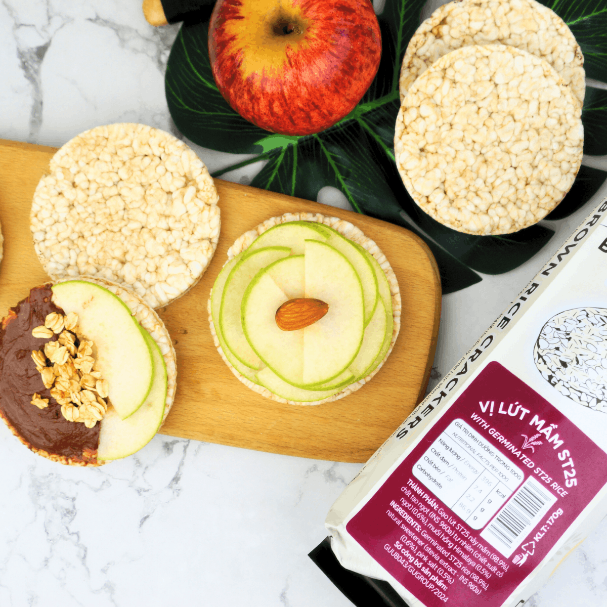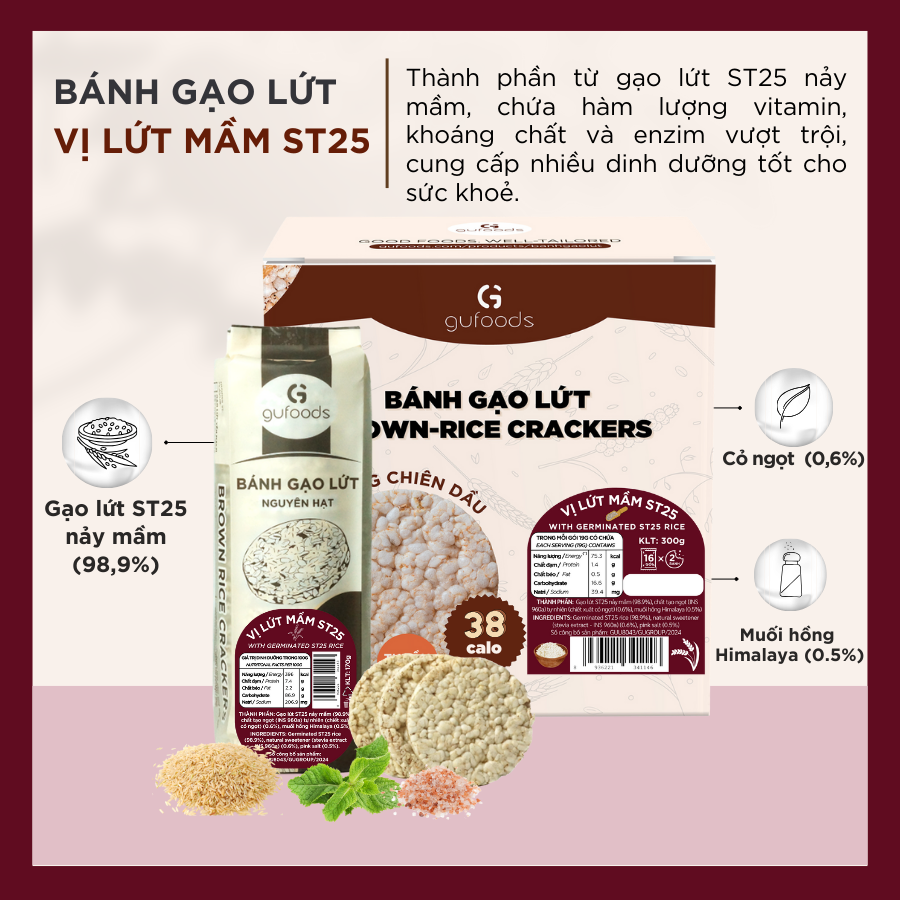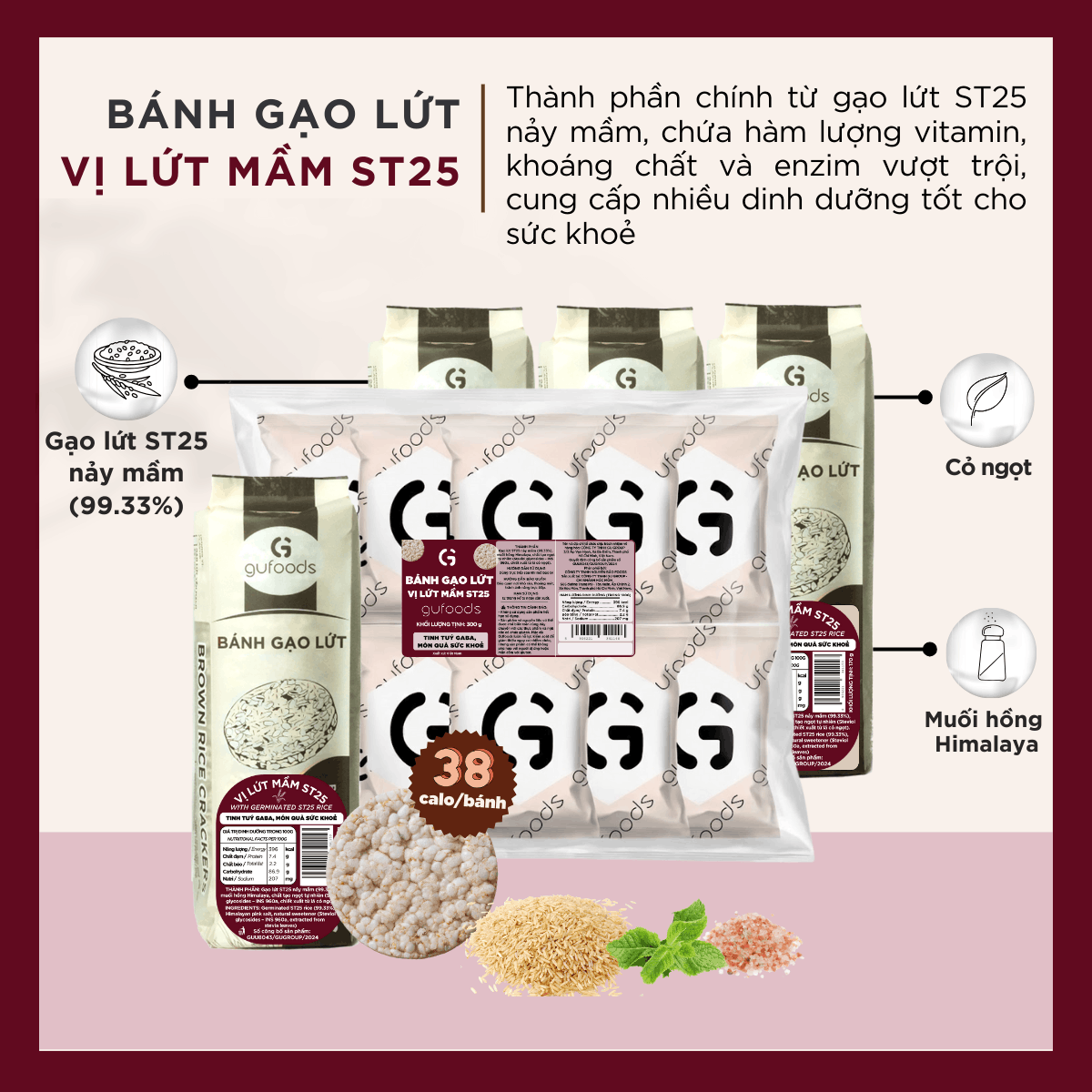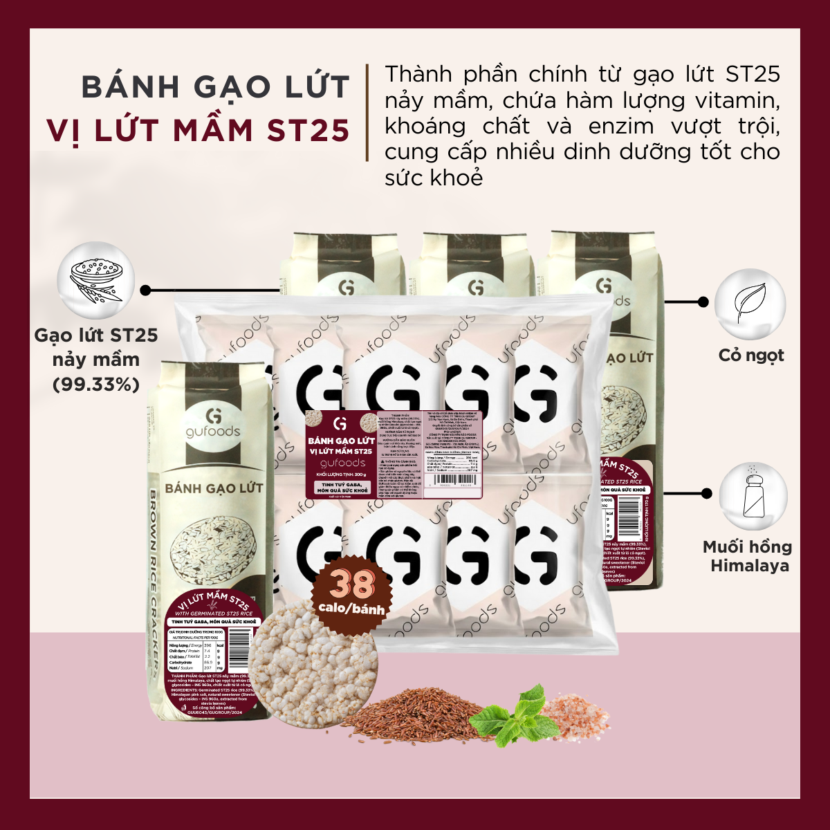Bánh gạo lứt vị gạo lứt mầm ST25 GUfoods với thành phần chính từ gạo lứt ST25 nảy mầm, chứa hàm lượng vitamin, khoáng chất và enzim vượt trội, cung cấp nhiều dinh dưỡng tốt cho sức khoẻ. Bánh không đường, không chiên qua dầu, giàu chất xơ, có thể kết hợp cùng nhiều công thức, giúp bữa ăn healthy của bạn thương đa dạng và phong phú.