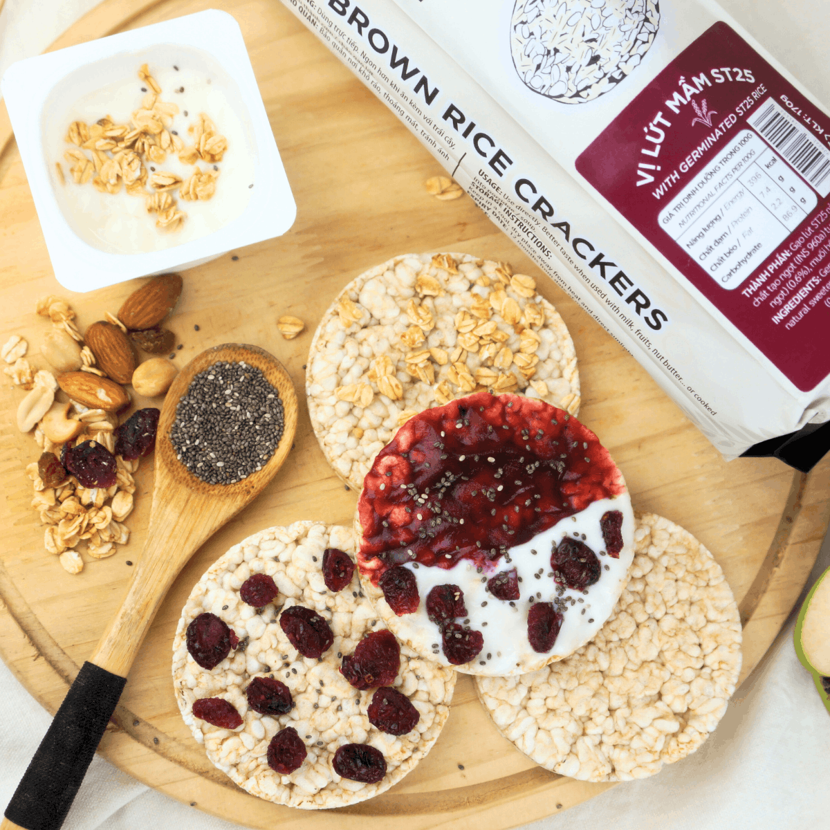 Bánh giòn rụm, xốp thơm vị gạo lứt mầm tự nhiên.