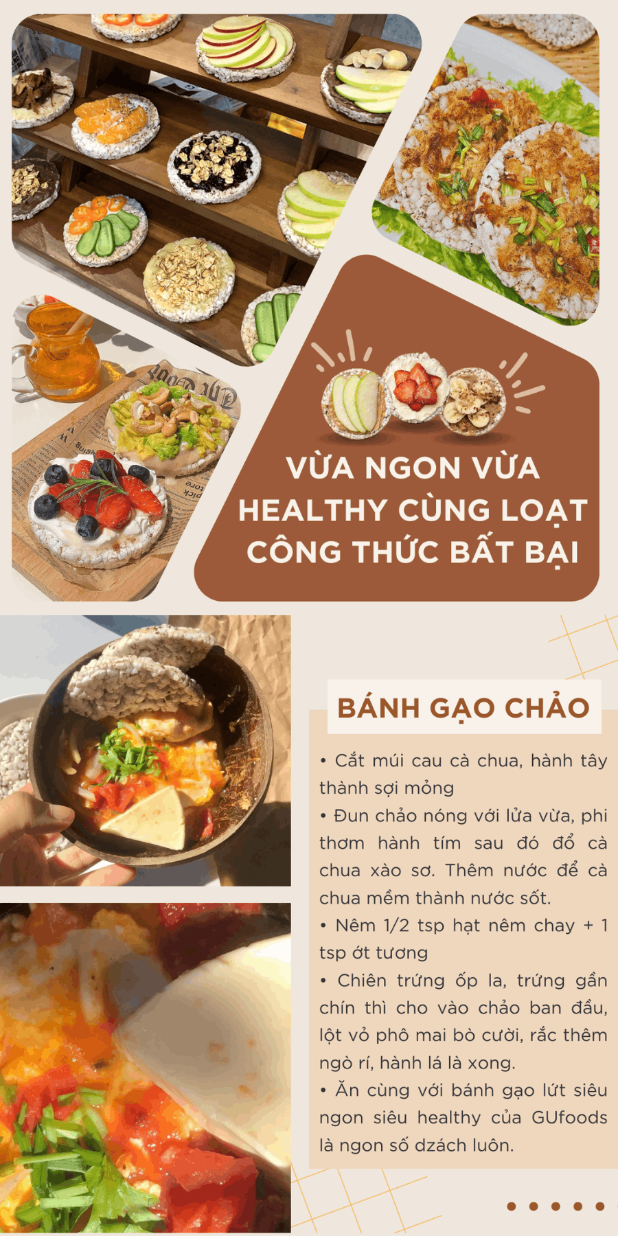 Tính tiện lợi cao có được là nhờ bánh gạo lứt đã chín sẵn, không cần chế biến gì nhiều mà vẫn có thể kết hợp và biến tấu được nhiều công thức healthy ngon lành như: