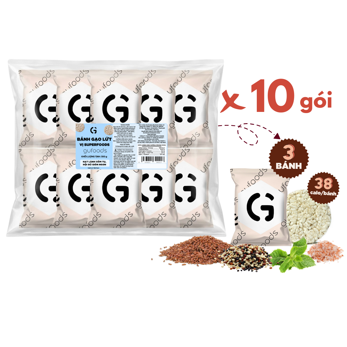 - Sản phẩm và nguyên liệu có thể chế biến trên cùng dây chuyền với các thực phẩm và ngũ cốc có chứa gluten. Mặc dù GUfoods luôn nỗ lực kiểm soát để giảm thiểu nguy cơ nhiễm chéo, nhưng sản phẩm có thể không phù hợp với người dị ứng hoặc mẫn cảm với gluten.