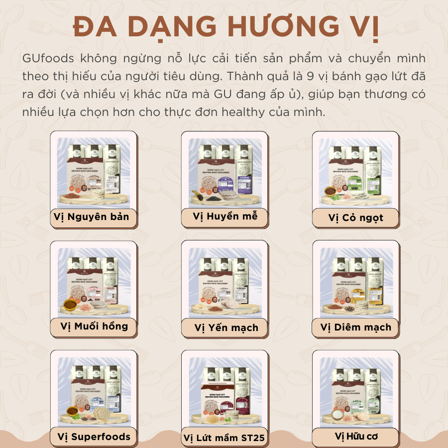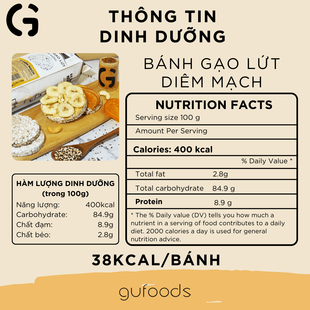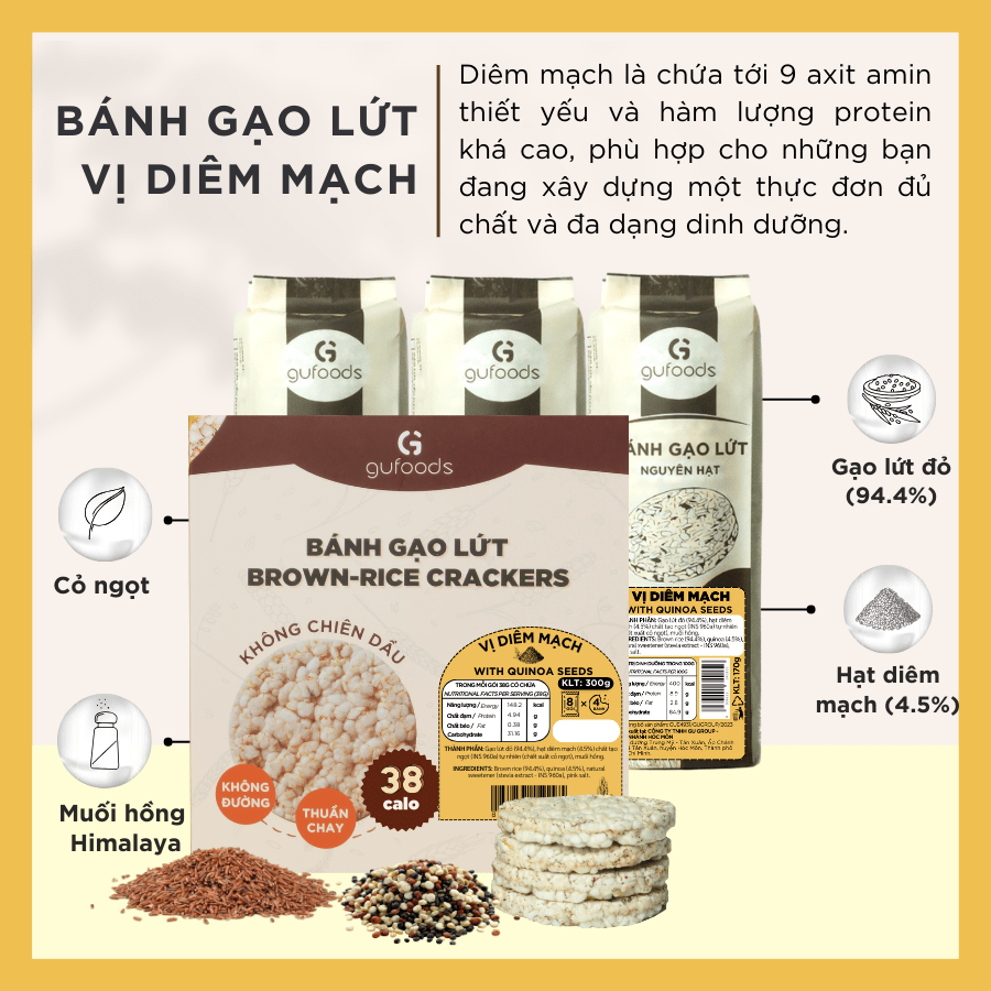 Bánh gạo lứt GUfoods vị Diêm mạch là sự kết hợp hài hòa giữa gạo lứt giàu chất xơ và hạt diêm mạch (quinoa) giàu dinh dưỡng với 9 loại axit amin thiết yếu. Không chỉ giàu chất xơ, vitamin và khoáng chất, diêm mạch còn có đặc tính chống oxy hóa, hỗ trợ trao đổi chất và tăng cường sức khỏe. Tất cả được gói gọn trong một miếng bánh nhỏ gọn, ngon lành, phù hợp với mọi chế độ ăn lành mạnh như eat clean, thuần chay hay thực dưỡng. Đây là món snack lý tưởng cho bữa sáng nhanh gọn, bữa ăn nhẹ tiện lợi hay nạp năng lượng giữa ngày mà vẫn đảm bảo tiêu chí ngon - sạch - lành.