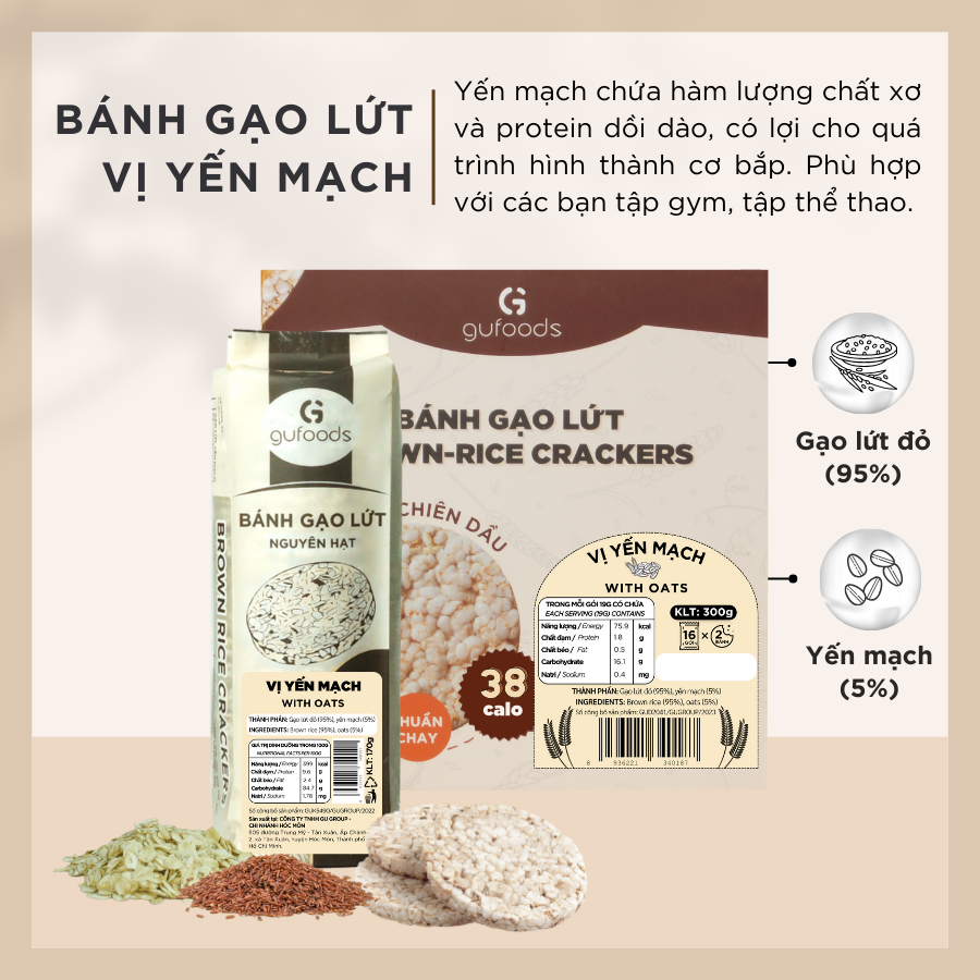 Bánh gạo lứt GUfoods vị Yến mạch là lựa chọn nhẹ nhàng, lành mạnh cho những bạn thương đang theo chế độ eat clean, healthy. Bánh kết hợp 2 nguyên liệu quen thuộc với các bạn thương yêu thích lành mạnh là gạo lứt và yến mạch. Bánh giòn xốp tự nhiên, không đường, không chiên dầu, dùng ăn sáng, ăn xế hay kết hợp cùng bơ hạt, trái cây đều ngon lành, tiện lợi.