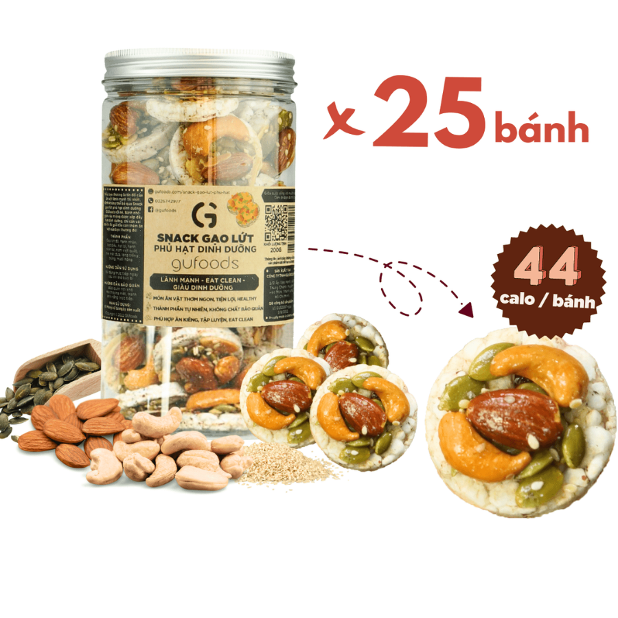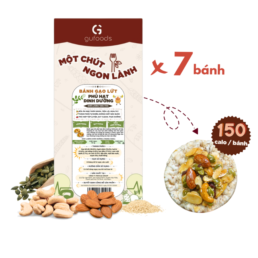 Những chiếc bánh gạo lứt giòn rụm phủ granola siêu hạt nhà GU chứa nhiều dinh dưỡng với 150kcal/cái giúp bạn thương nạp nhanh năng lượng.