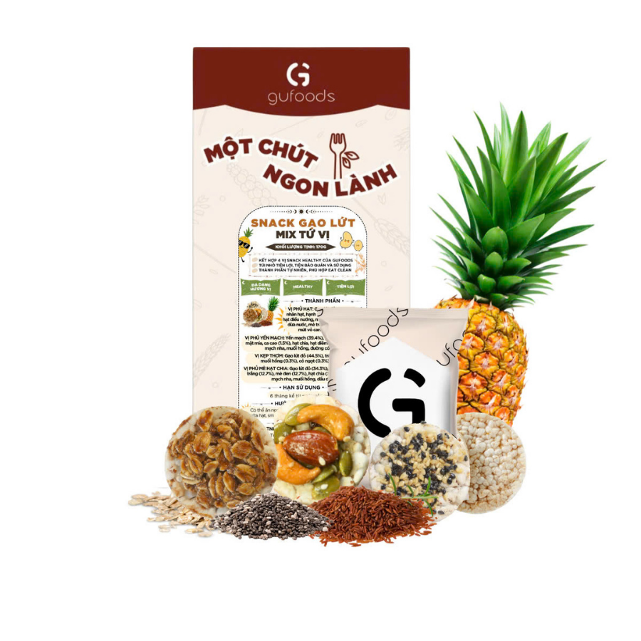 Snack gạo lứt mix tứ vị với 4 vị kết hợp: phủ hạt, kẹp thơm, phủ yến mạch socola, phủ mè hạt chia thơm ngon. Mỗi chiếc snack phủ hạt chứa 44 kcal, snack kẹp thơm chứa 22 kcal, snack phủ yến mạch socola chứa 17 kcal, snack phủ mè hạt chia chứa 19kcal.