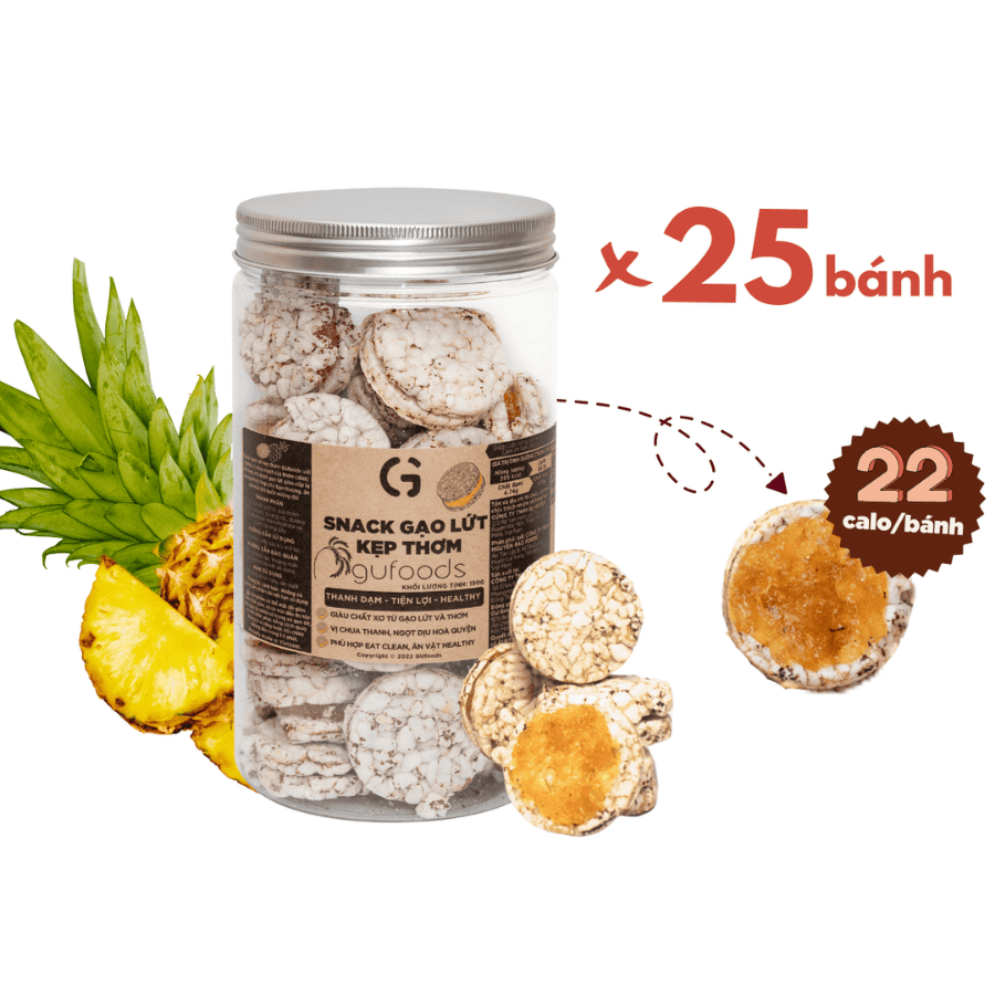 Trong 100g snack gạo lứt kẹp thơm chứa khoảng 365 kcal, tương đương khoảng 22 kcal/cái.