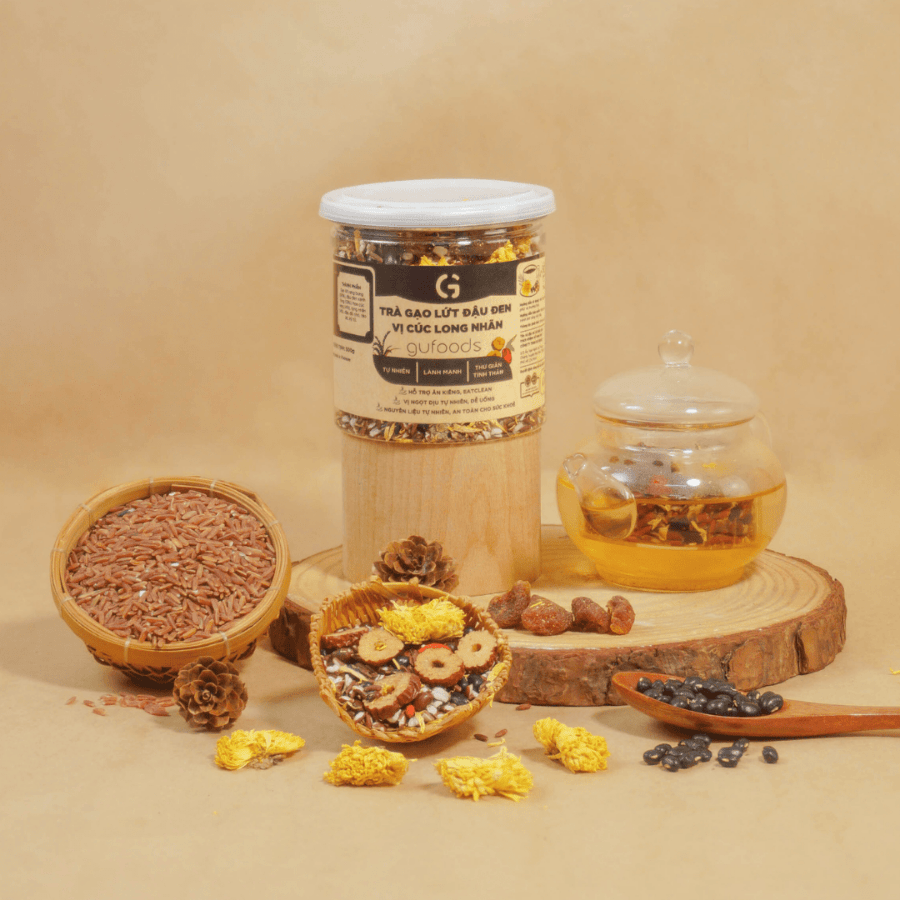 Trà gạo lứt đậu đen vị Cúc long nhãn GUfoods là lựa chọn uống ngon lành để tinh thần thoải mái trong những ngày Tết sum vầy. Với hàm lượng chất xơ cao, trà giúp hệ tiêu hóa hoạt động tốt hơn và hỗ trợ giấc ngủ ngon hơn.