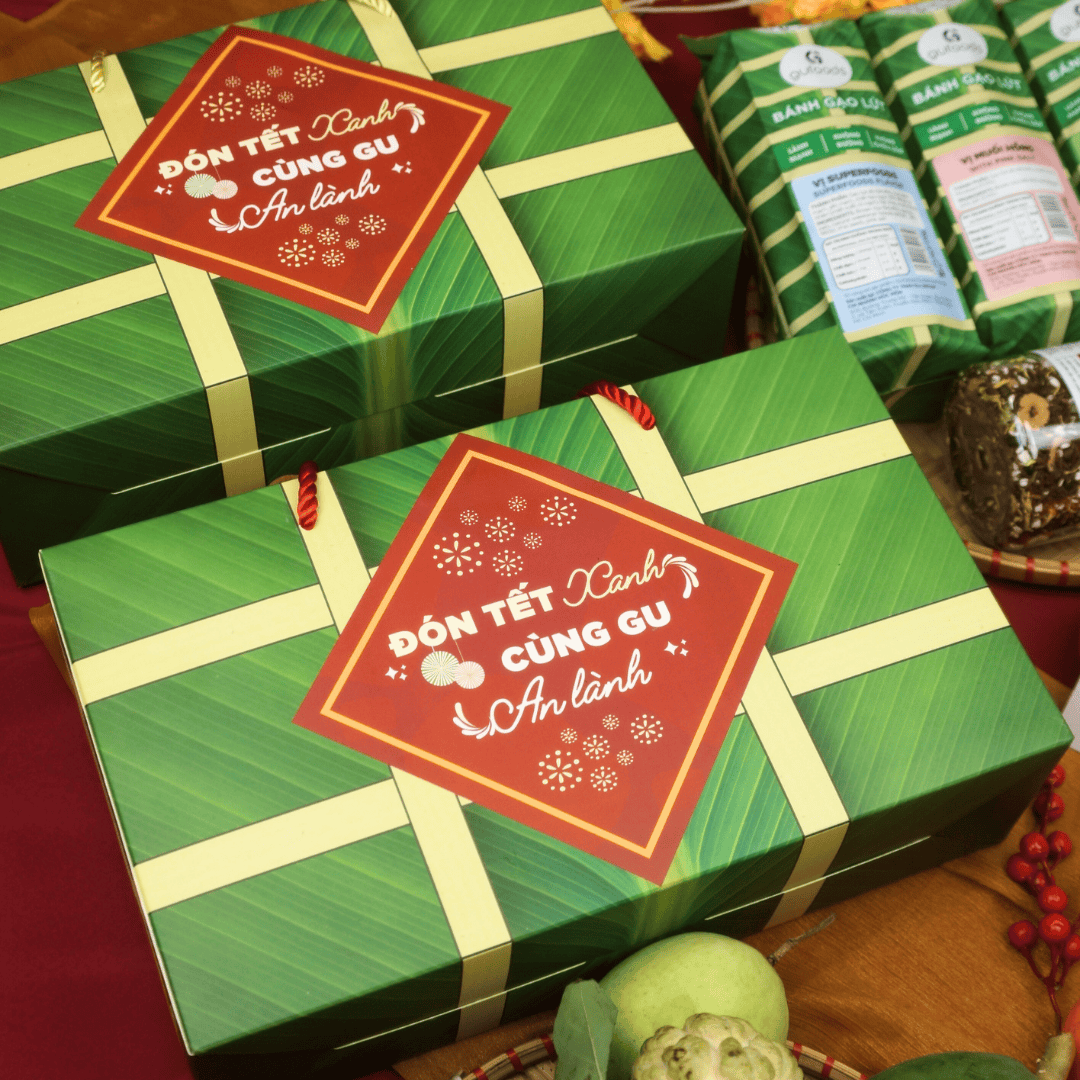 Hộp quà Như Ý GUfoods được thiết kế hình bánh chưng xanh tinh tế, vừa mang đậm nét truyền thống lại sáng tạo, hiện đại, mang đến cho người nhận lời chúc Tết chân thành và tình cảm. Hộp quà gồm các món bánh, trà healthy như: