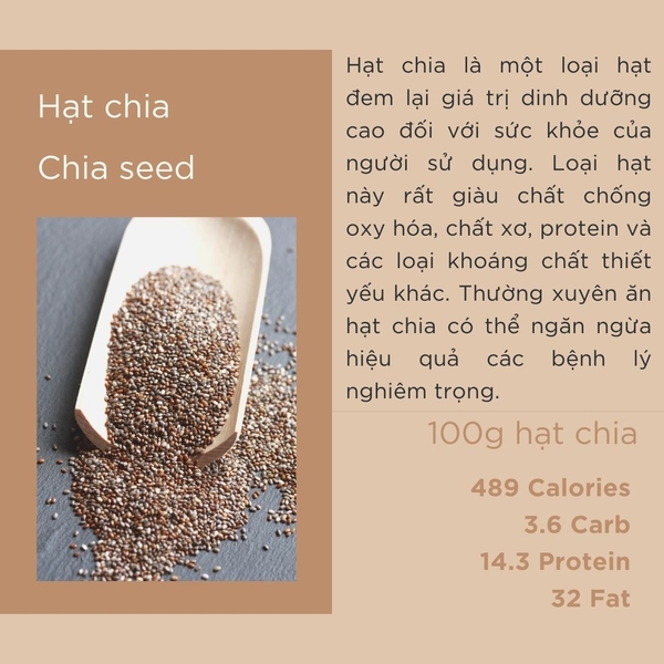 Hạt Chia là một loại hạt đem lại giá trị dinh dưỡng cao đối với sức khỏe của người sử dụng. Loại hạt này rất giàu chất chống oxy hóa, chất xơ, protein và các loại khoáng chất thiết yếu khác. Thường xuyên ăn hạt Chia có thể ngăn ngừa hiệu quả các bệnh lý nghiêm trọng.