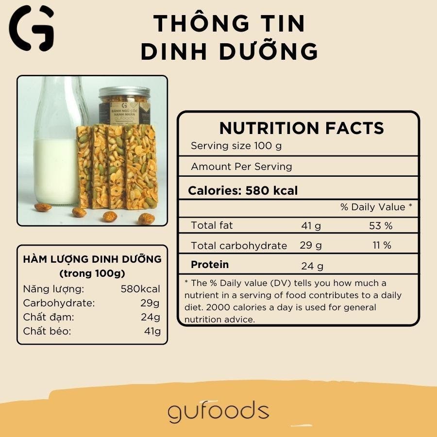 Bánh hạnh nhân ăn kiêng Gufoods bổ sung: Năng lượng: 475 kcal; Chất đạm: 5g; Carbohydrate: 33g; Chất béo: 15g. Bánh giàu chất xơ và dưỡng chất nhưng không bị dư đường và tinh bột rất phù hợp ăn kiêng và tốt hơn cho sức khoẻ.