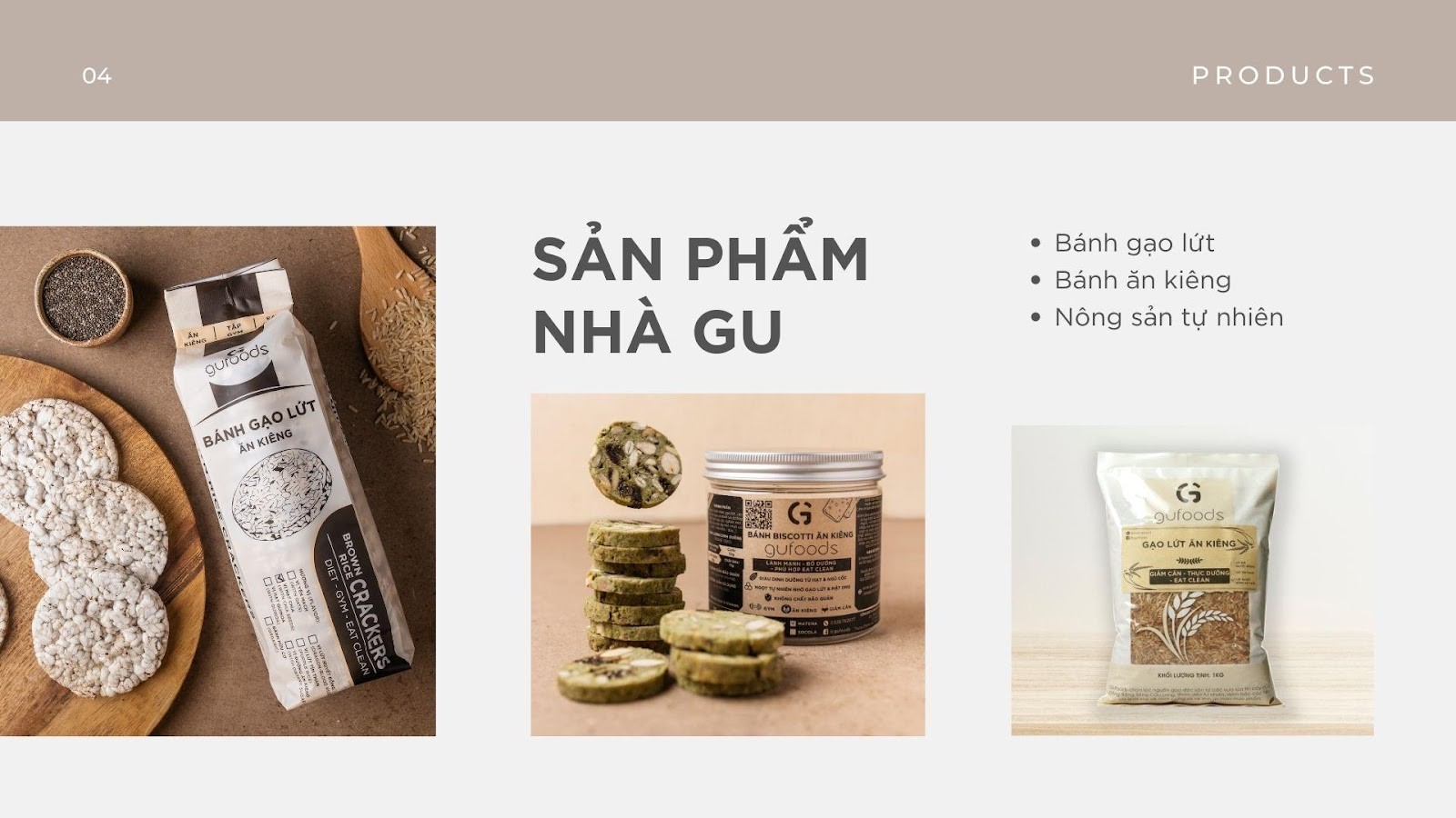 Sản phẩm nhà GU bao gồm 3 loại chính là: Bánh gạo lứt, bánh ăn kiêng, nông sản sạch