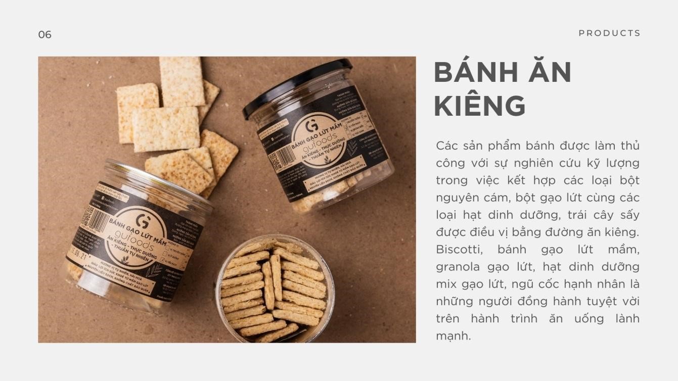 Gufoods đa dạng các mặt hàng bao gồm 3 nhóm hàng chính là: bánh gạo lứt ăn kiêng, bánh ăn kiêng và Nông sản sạch.