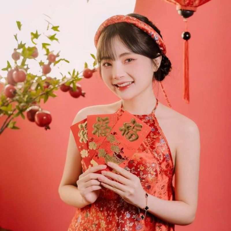 Cũng tương tự như chụp hình với quạt, bạn thương có thể chụp với background được trang trí theo phong cách Tết. Tạo dáng cùng những chiếc bao lì xì sẽ trông bạn tinh nghịch và đáng yêu nên bạn nên lựa chọn những trang phục tươi trẻ, không nên quá trang trọng.