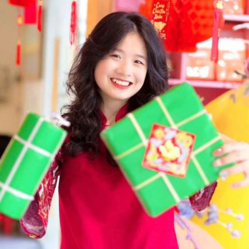 Kiểu tạo dáng đơn giản với tay cầm bánh chưng với background được trang trí những lồng đèn, bao lì xì Tết sẽ mang lại một không khí Tết ấm áp, gần gũi.