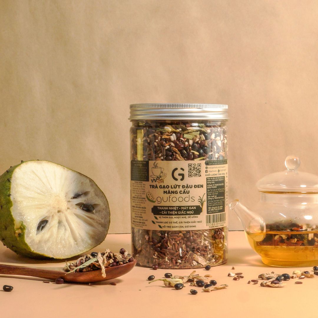 Măm măm trà gạo lứt đậu đen vị mãng cầu với snack healthy nhà GU