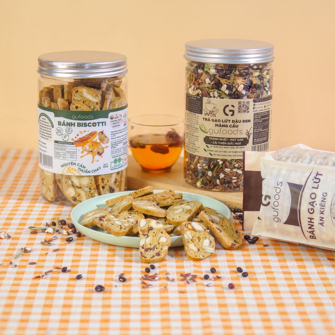 Trà chiều thư giãn cùng trà gạo lứt đậu đen mãng cầu và bánh gạo lứt mầm GUfoods